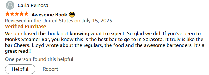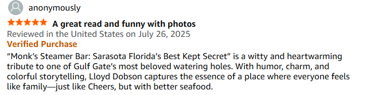 Step inside Monk’s Steamer Bar, where everybody really does know your name—and if they don’t yet, they will. Monk’s Steamer Bar: Sarasota’s Hidden Gem in Gulf Gate – SECOND EDITION is a heartfelt, humorous, and easy-reading celebration of a neighborhood institution that’s equal parts bar, seafood haven, and community living room. Told through unforgettable characters, laugh-out-loud moments, and genuine stories of friendship, this book captures the soul of a place where strangers become regulars, regulars become family, and every night has a story worth telling. Pull up a stool, order your favorite drink, and enjoy a front-row seat to Sarasota’s best-kept secret.